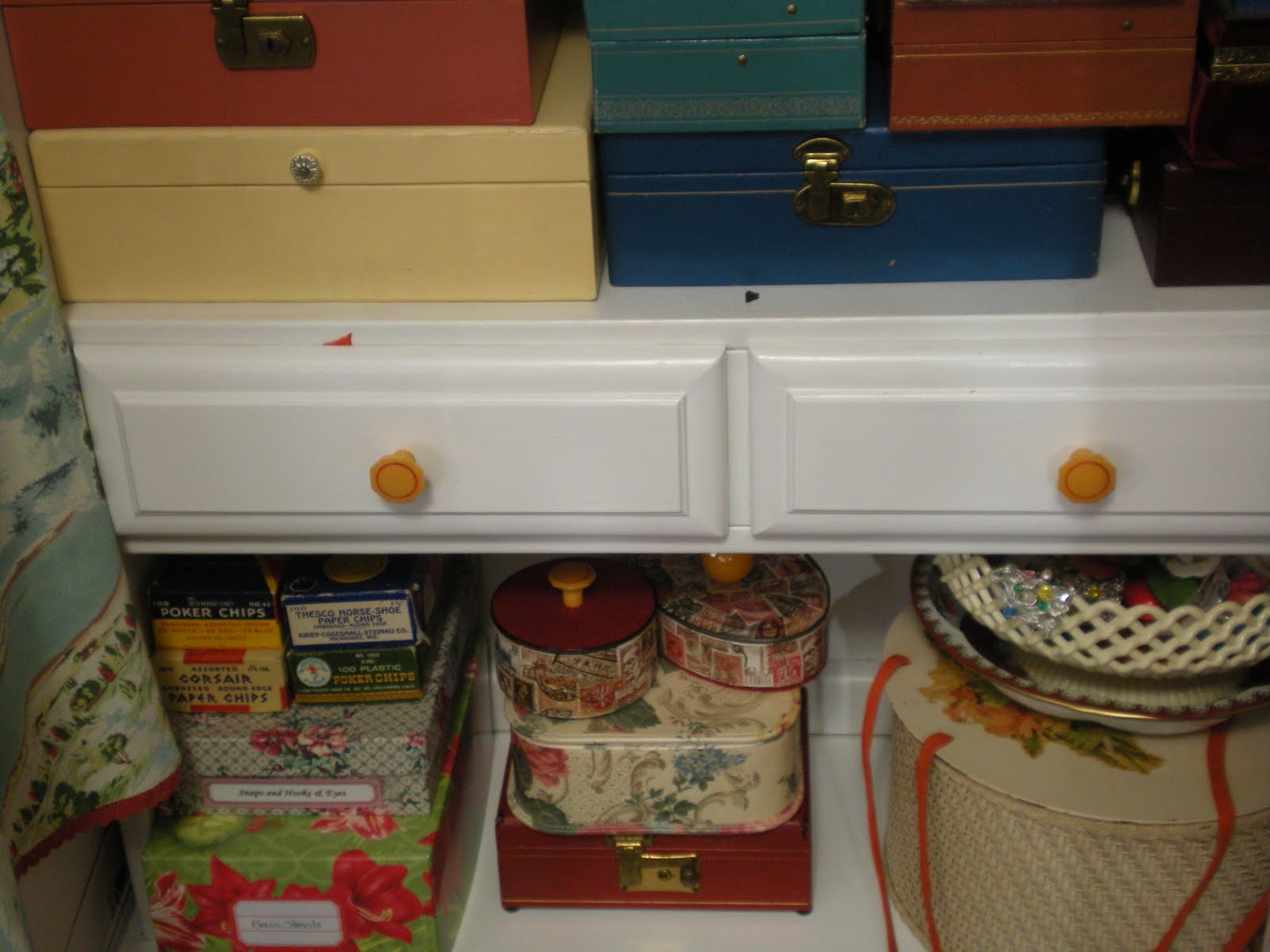 These two jewelry boxes hold my favorite mother of pearl and metal buttons.  The card catalog drawers hold tags, both finished and unfinished.